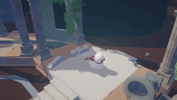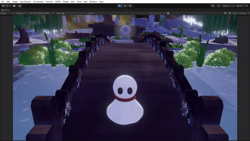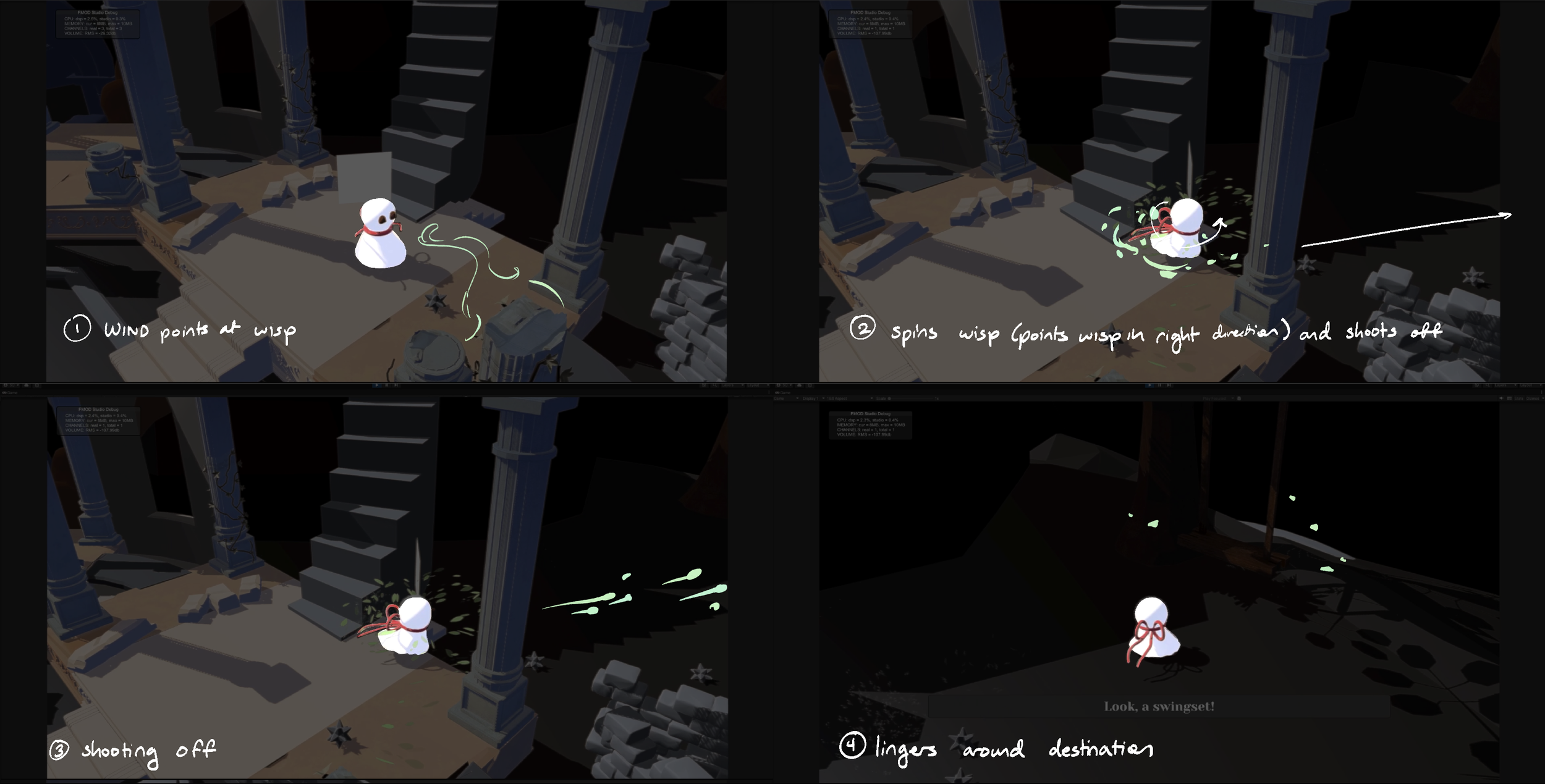 Global wind: Wind as present around Wisp all the time. Blowing feels like an outward motion, so we added a vignette and pushed the camera out a little.