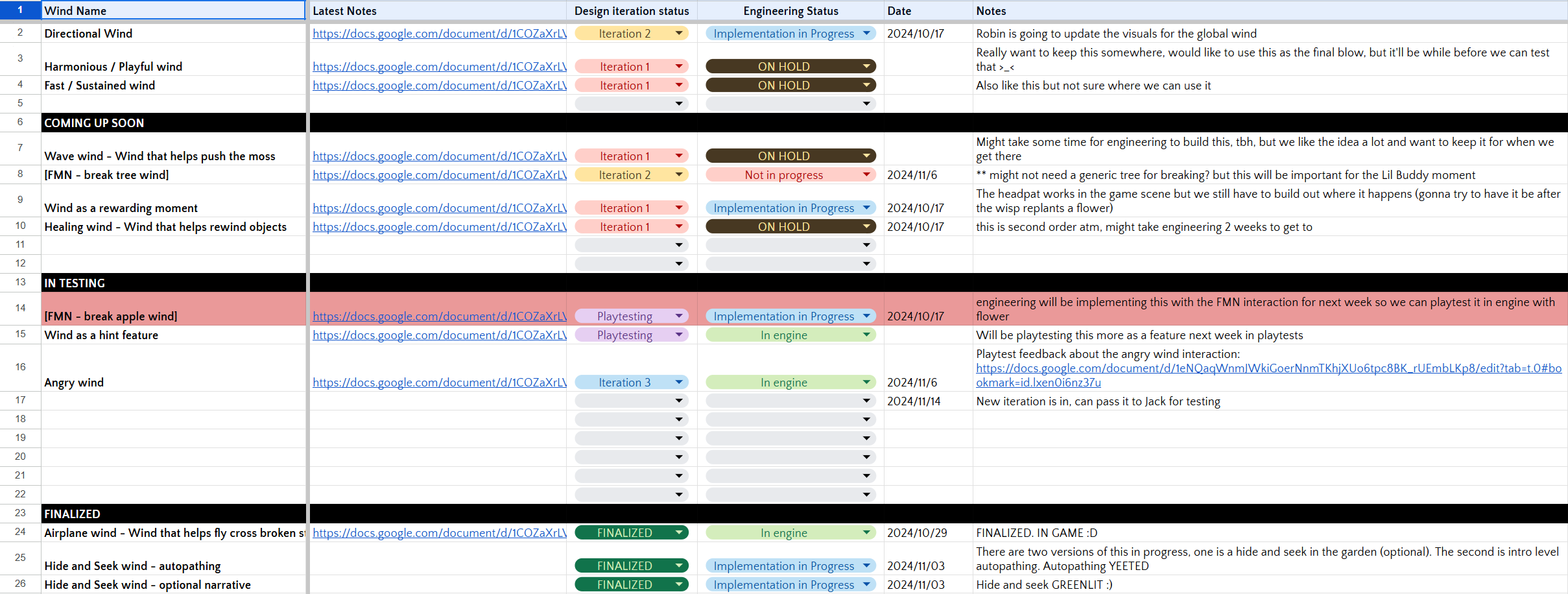 Fast prototype wind interaction, implement and iterate on the wind feature in collaboration with engineering and art.