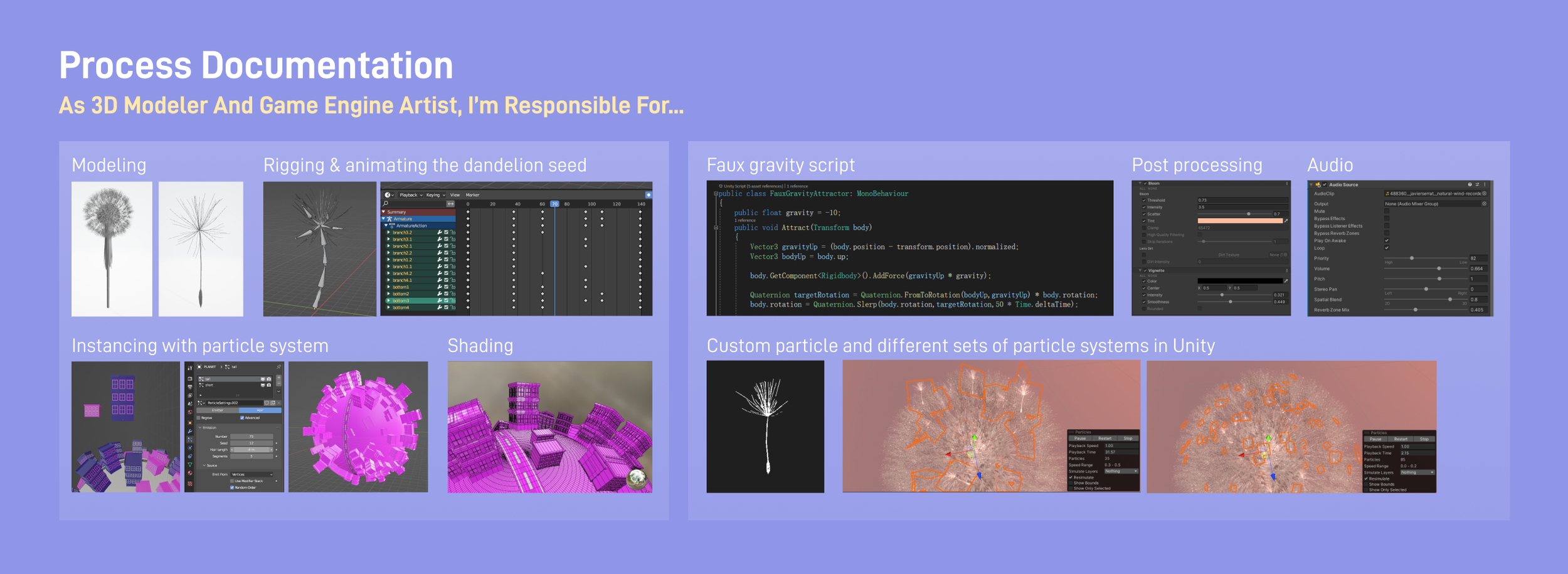 Created dandelion seed particles for the ending scene with two spawning points based on the player's position, using LODs to optimize performance on the high-poly planet.